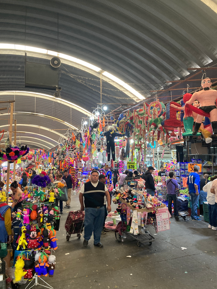 This is my favorite market—easy to navigate, friendly people, and amazing food. We'll try delicious carnitas or huaraches (a thick corn tortilla with beans and prickly pear cactus salad). Aisles are filled with vibrant flowers, and vendors expertly shine tomatoes to an extra red hue! Tell me about Mexican veggie marketing hacks!